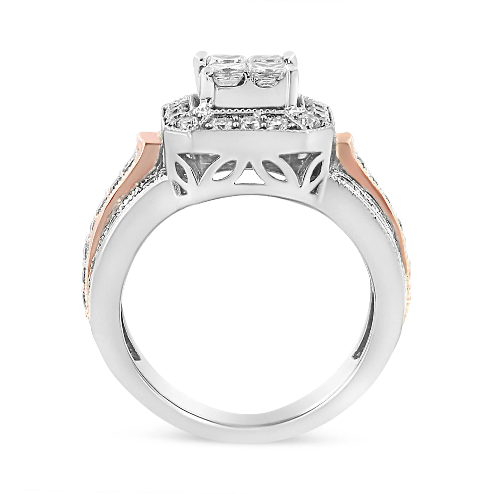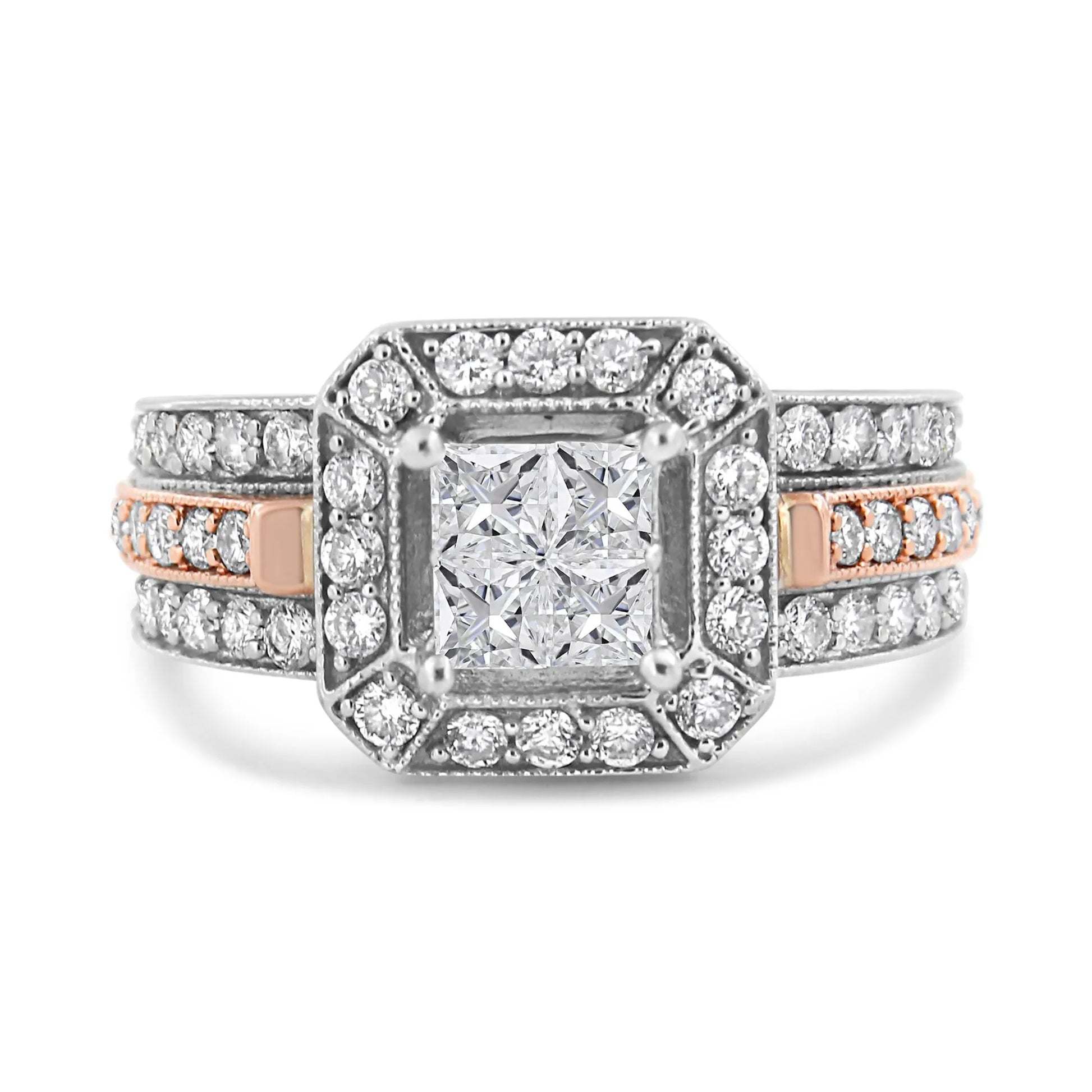 This intricately designed cocktail ring has a composite design that shines with 1 1/8 CTW of natural diamonds. A cluster of 4 princess-cut diamonds of I-J color and SI2-I1 clarity sits at the center of this piece, and is flanked by a separated halo of round-cut diamonds. The 14k white gold band has a streak of rose-gold going through the center. Round-cut diamonds embellish the band as well for an extra dazzling effect. This cluster ring will look magnificent on your finger.