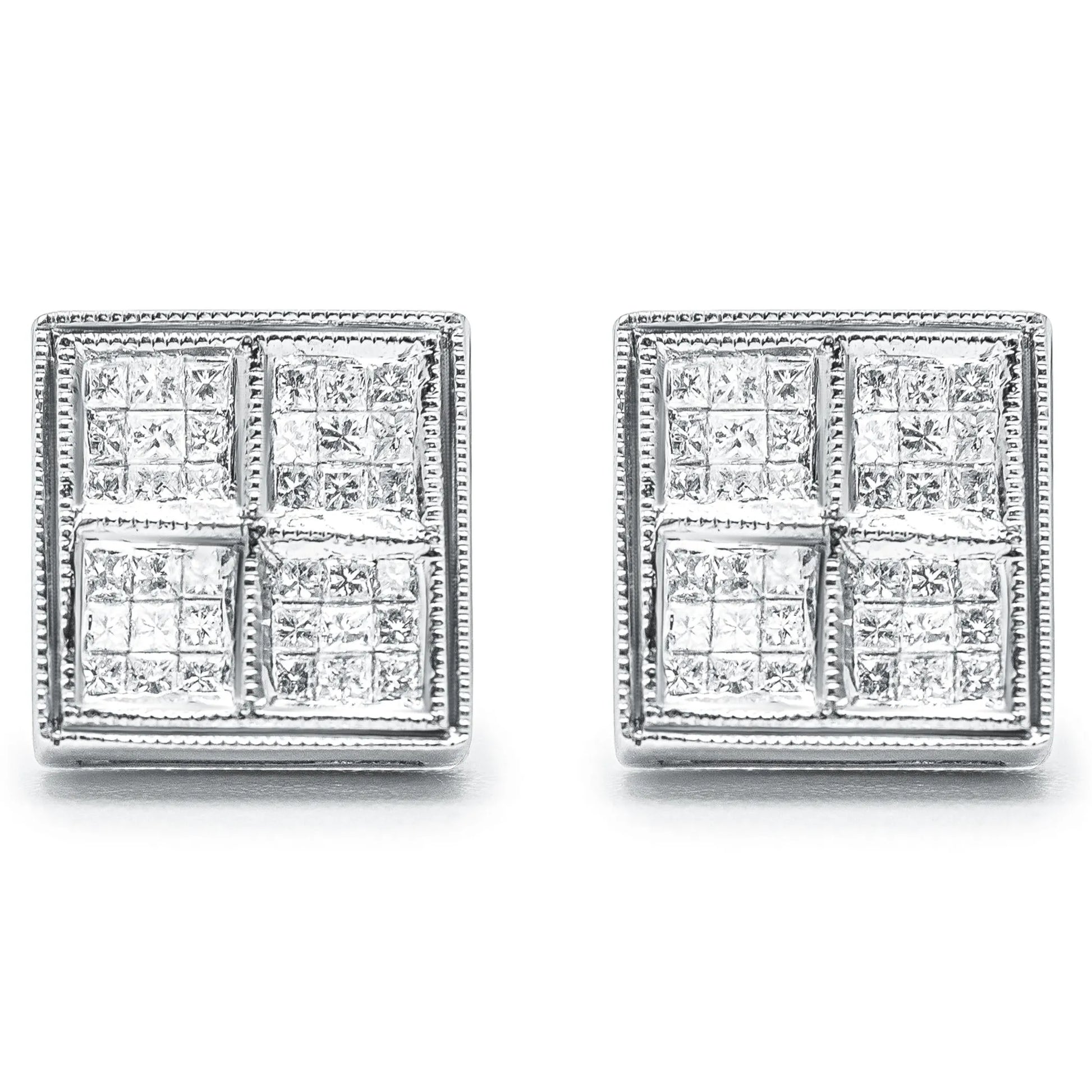 A unique twist on a classic design, these 1/2 CTW studs are beautifully crafted in 14k white gold. Four square clusters of natural, princess-cut H-I Color, SI1-SI2 Clarity diamonds make up the design of these stunning earrings. This piece has a push back mechanism for a safe and secure fit on your ears. You will love how these composite diamond studs shine and add a touch of glamour to your look!