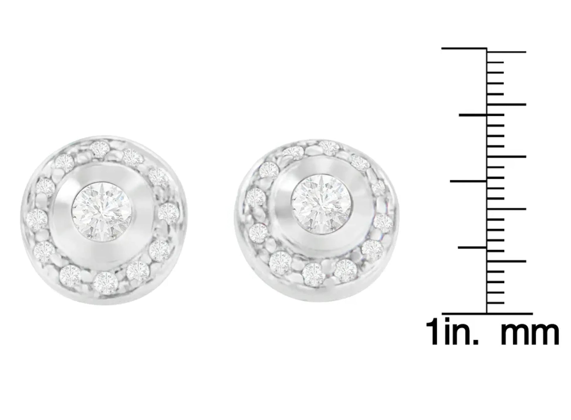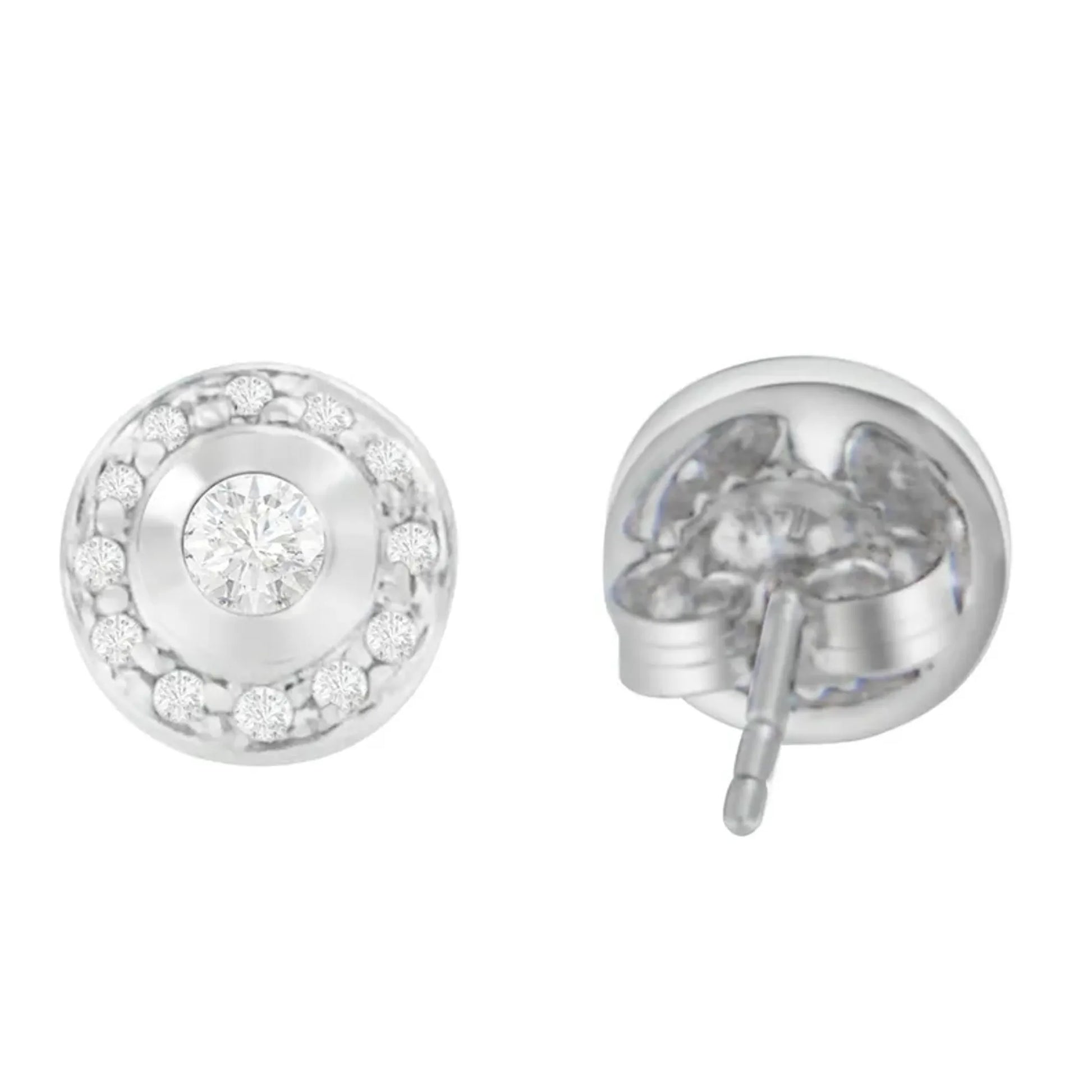 Nothing is quite so glamorous as a pair of round diamond studs. This pair, featured in 14k white gold, showcases a central prong set round-cut diamond of H-I color and SI2-I1 clarity embraced by a circle of smaller bezel set diamonds, separated by a ring of highly polished 14K white gold. Secured with push backs.