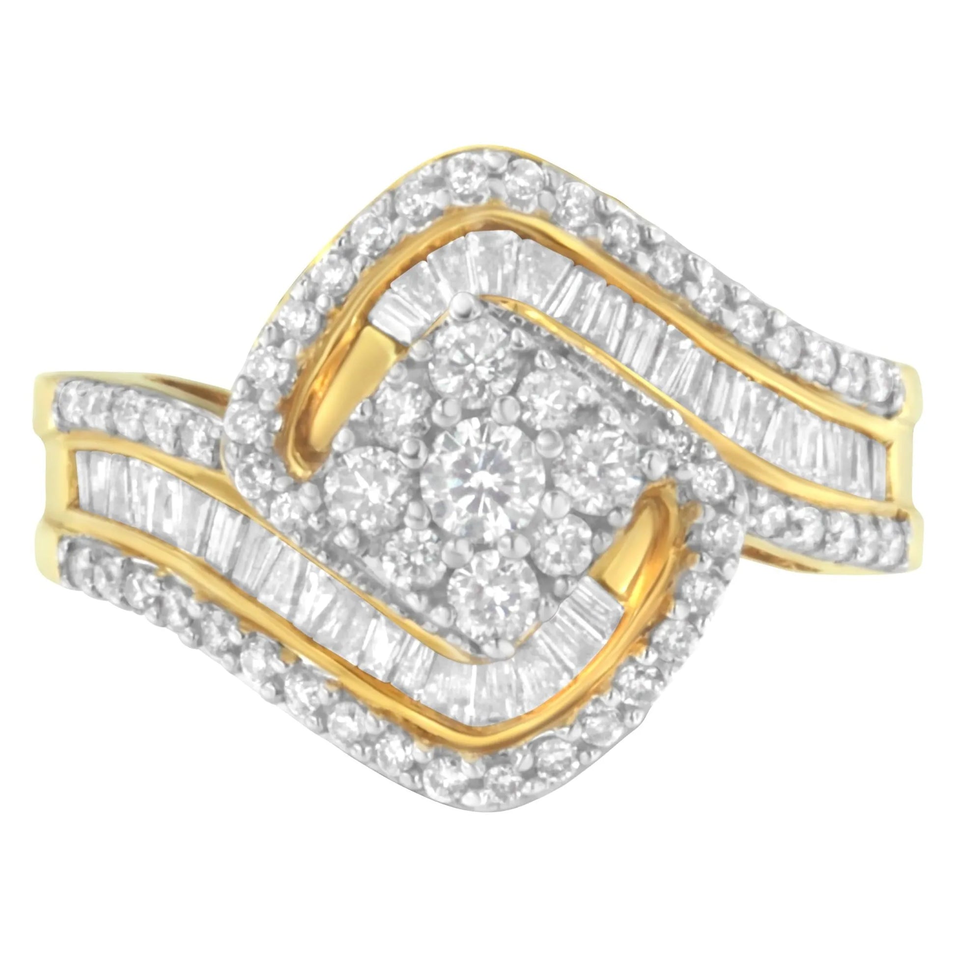 1 Carat Baguette & Brilliant-Cut Diamond Round Floral Cluster Ring with Swirl Wrapped Triple Row Band in 14K Yellow Gold