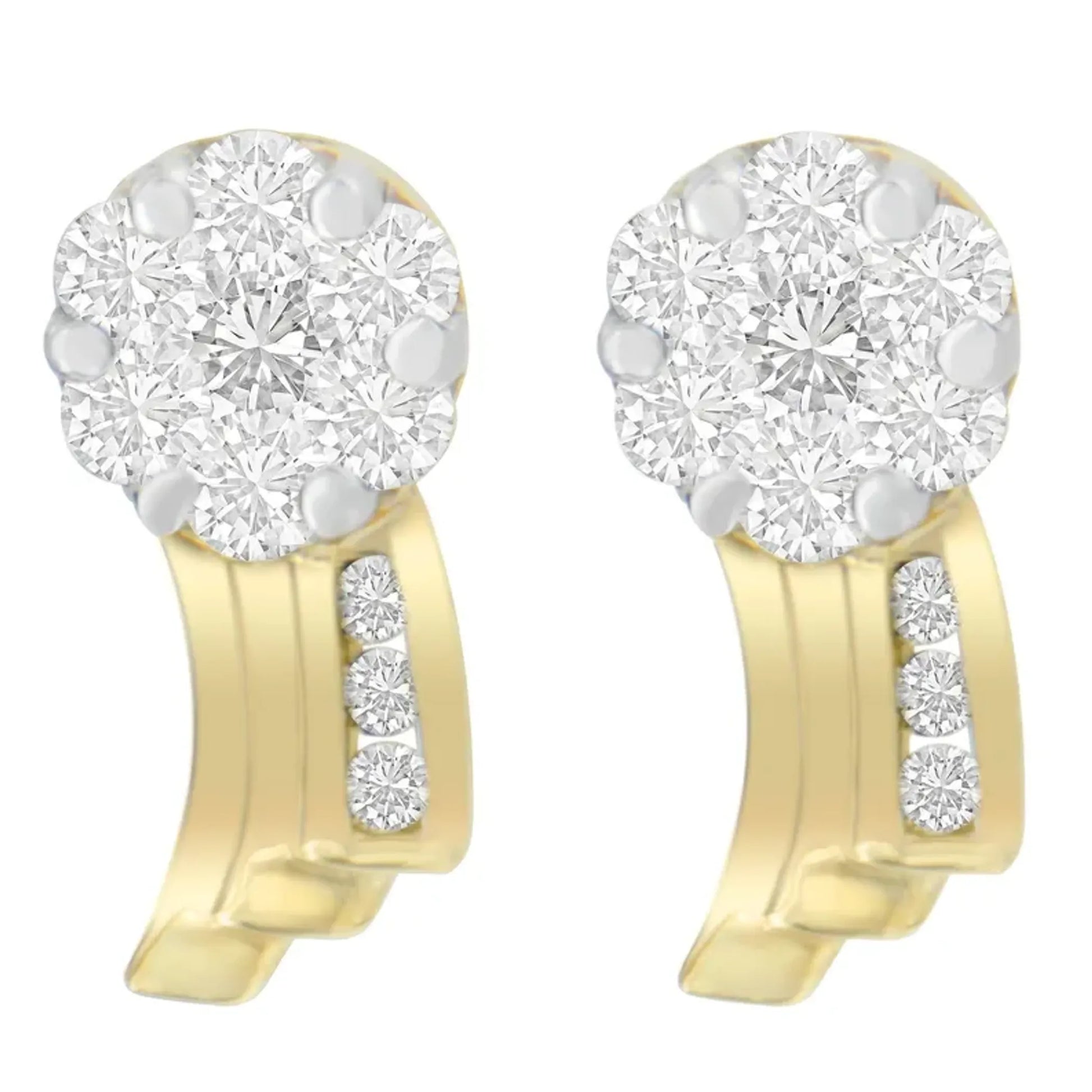 Inspiring vintage details with heirloom styles these stylish earrings are sure to cherish every onlooker. Chisel to perfection, the earrings are constructed of 14 karat yellow gold and buffed to a luster with brilliance. The clusters of diamonds have I-J color and SI1-SI2 clarity. Representing a stunning design, the earrings are enchanted with shimmery decoration of round cut diamonds in a prong setting.